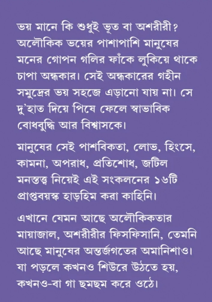 মানুষের সেই পাশবিকতা, লোভ, হিংসে, কামনা, অপরাধ, প্রতিশোধ, জটিল মনস্তত্ত্ব নিয়েই এই সংকলনের ১৬টি প্রাপ্তবয়স্ক হাড়হিম করা কাহিনি। এখানে যেমন আছে অলৌকিকতার মায়াজাল, অশরীরীর ফিসফিসানি, তেমনি আছে মানুষের অন্তর্জগতের অমানিশাও। যা পড়লে কখনও শিউরে উঠতে হয়, কখনও-বা গা ছমছম করে ওঠে।