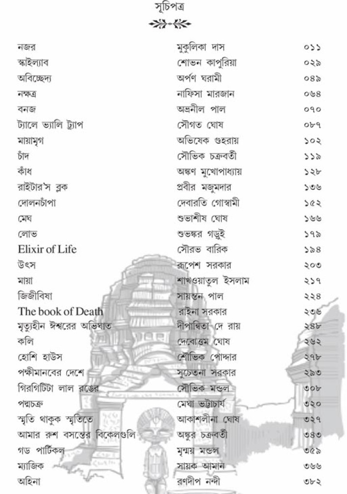 নাকি মহাকাশে? আআবার ঠিক তার পরেই দেখতে পাবেন তীব্র ষড়যন্ত্র অথবা লোভ কীভাবে বদলে দিচ্ছে আমাদের সুখের জীবন। কেমন হবে যদি কয়েক দশক পর খাবারের জন্যে, বেঁচে থাকার জন্যে লড়াই করতে হয়? কখনও মিশরের খনসু দেবতার মন্দির, কখনও বা বেনারসের ঘাটে মিলমিশ ঘটে যাবে ইতিহাসের সঙ্গে পুরাণের, মিথের সঙ্গে বাস্তবের, জীবনের সঙ্গে কল্পবিজ্ঞানের। রাইটার্স ব্লক থেকে বেরোনোর অদ্ভুত উপায়ের খোঁজ কোথায় নিয়ে গিয়ে ফেলবে শেষ অবধি? কীভাবে পাবেন এলিক্সির অব লাইফের খোঁজ?