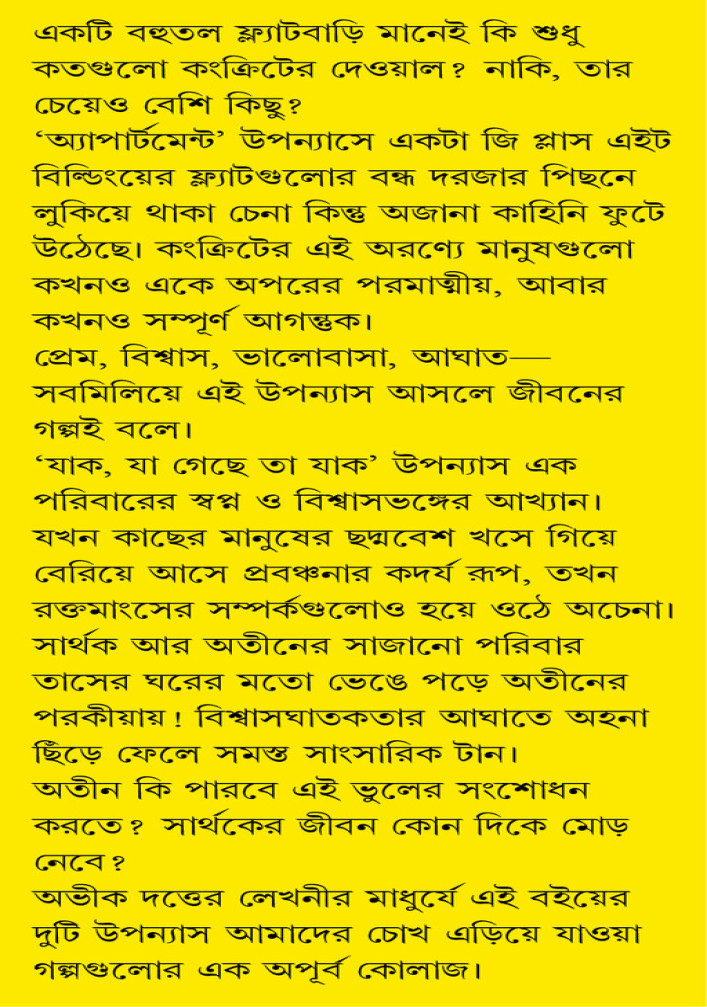 অভীক দত্তের লেখনীর মাধুর্যে এই বইয়ের দুটি উপন্যাস আমাদের চোখ এড়িয়ে যাওয়া গল্পগুলোর এক অপূর্ব কোলাজ।
