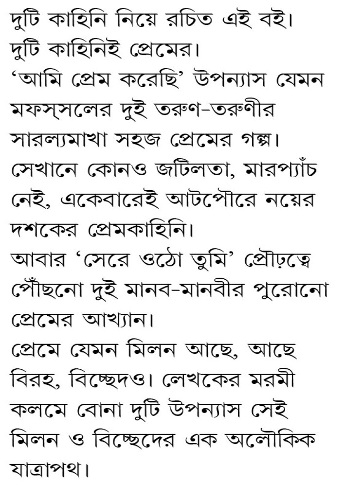হিনি। আবার ‘সেরে ওঠো তুমি’ প্রৌঢ়ত্বে পৌঁছনো দুই মানব-মানবীর পুরোনো প্রেমের আখ্যান। প্রেমে যেমন মিলন আছে, আছে বিরহ, বিচ্ছেদও। লেখকের মরমী কলমে বোনা দুটি উপন্যাস সেই মিলন ও বিচ্ছেদের এক মধুময় যাত্রাপথ।