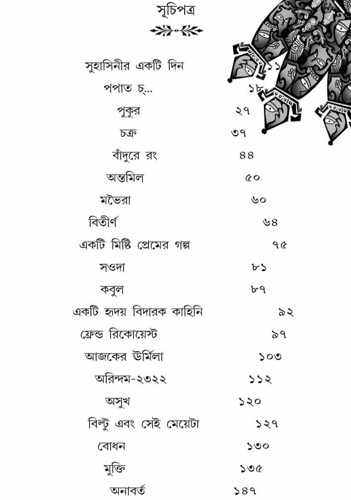 কুড়িটি গল্প নিয়ে তরুণ লেখক মৌসুমী মুখোপাধ্যায়ের এই গল্প সংকলন। মৌসুমী গল্প লেখেন আমার আপনার গা ঘেঁষে থাকা চরিত্রদের নিয়ে। কিন্তু গল্প-শেষে চরিত্রগুলো কখনও চেনা থেকে অচেনা হয়ে যায়। আবার কখনও চেনা থেকে আশ্চর্