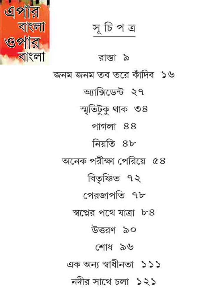 এই গল্প সংকলনে কিছু পশ্চিমবঙ্গের লেখকের ও কিছু বাংলাদেশের লেখকের মিলিয়ে মোট ১৪টি গল্প স্থান পেয়েছে। “রাস্তা”, “জনম জনম তব তরে কাঁদিব”, “অনেক পরীক্ষা পেরিয়ে” গল্পগুলো যেমন ভালোবাসার অকৃপণ রসে সিক্ত ঠিক তেমনই “পাগলা”, “বিতৃষ্ণিত”, “পেরজাপতি” গল্পগুলো মানবজীবনে প্রতিনিয়ত ঘটে চলা মনস্তাত্ত্বিক টানাপড়েনের এক অপূর্ব আখ্যান। আবার একটি কুকুরকে কেন্দ্র করে লেখা “শোধ” ও শালিক পাখির আখ্যান “উত্তরণ” পাঠক হৃদয় জয় করে নেবে তাতে কোন সন্দেহ নেই।