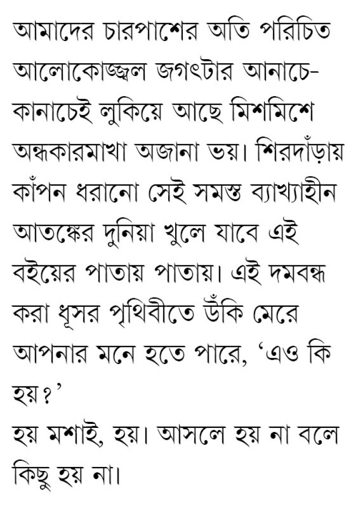 আমাদের চারপাশের অতি পরিচিত আলোকোজ্জ্বল জগৎটার আনাচে-কানাচেই লুকিয়ে আছে মিশমিশে অন্ধকারমাখা অজানা ভয়। শিরদাঁড়ায় কাঁপন ধরানো সেই সমস্ত ব্যাখ্যাহীন আতঙ্কের দুনিয়া খুলে যাবে এই বইয়ের পাতায় পাতায়। এই দমবন্ধ ক