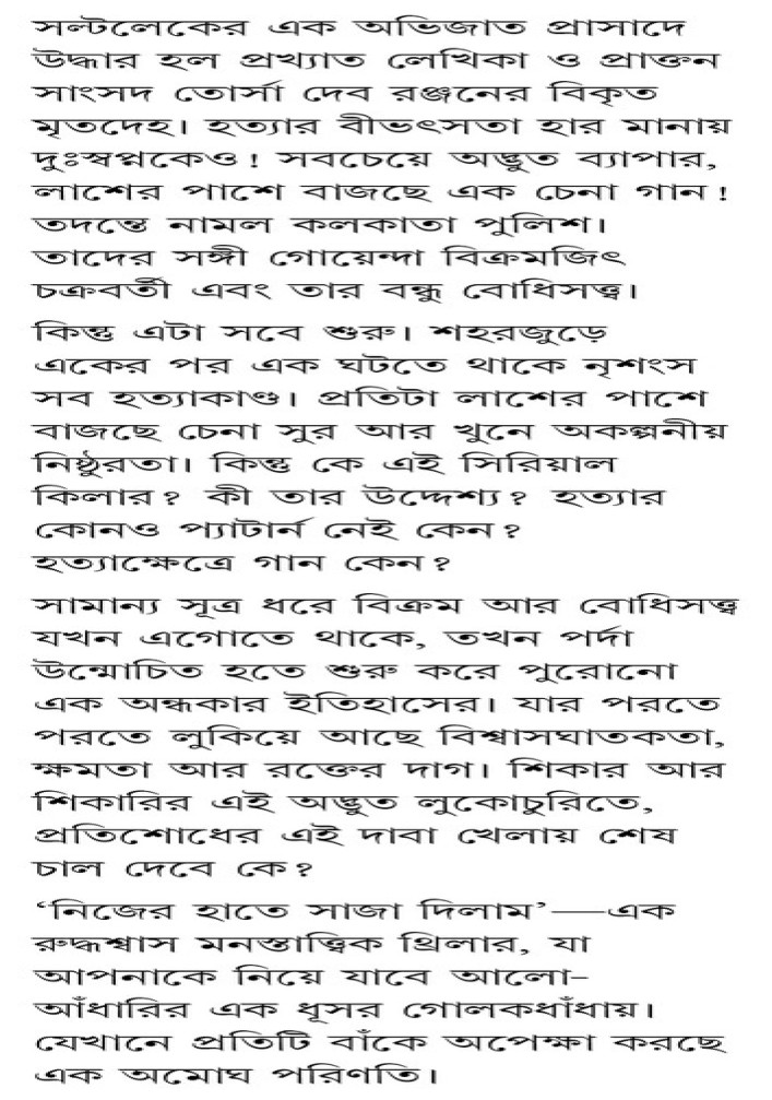 'নিজের হাতে সাজা দিলাম'-এক রুদ্ধশ্বাস মনস্তাত্ত্বিক থ্রিলার, যা আপনাকে নিয়ে যাবে আলো-আঁধারির এক ধূসর গোলকধাঁধায়। যেখানে প্রতিটি বাঁকে অপেক্ষা করছে এক অমোঘ পরিণতি।