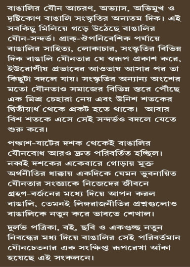 বাঙালির যৌন আচরণ, অভ্যাস, অভিমুখ ও দৃষ্টিকোণ বাঙালি সংস্কৃতির অন্যতম দিক। এই সবকিছ...