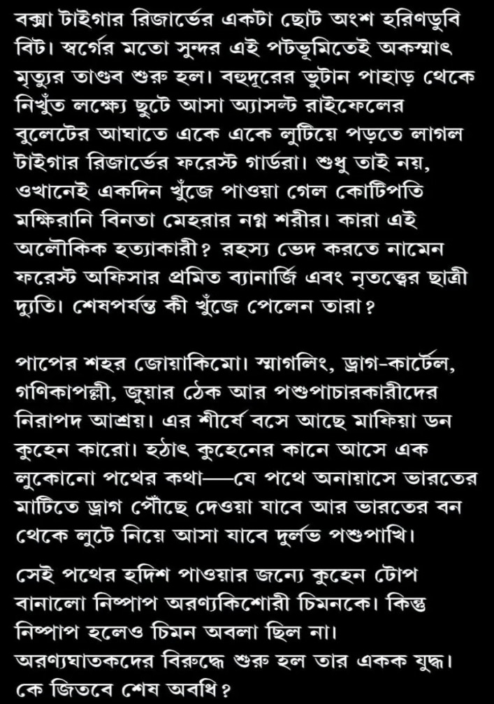 লুটিয়ে পড়তে লাগল টাইগার রিজার্ভের ফরেস্ট গার্ডরা। শুধু তাই নয়, ওখানেই একদিন খুঁজে পাওয়া গেল কোটিপতি মক্ষিরানি বিনতা মেহরার নগ্ন শরীর। কারা এই অলৌকিক হত্যাকারী? রহস্য ভেদ করতে নামেন ফরেস্ট অফিসার প্রমিত ব্যানার্জি এবং নৃতত্ত্বের ছাত্রী দ্যুতি। শেষপর্যন্ত কী খুঁজে পেলেন তারা?