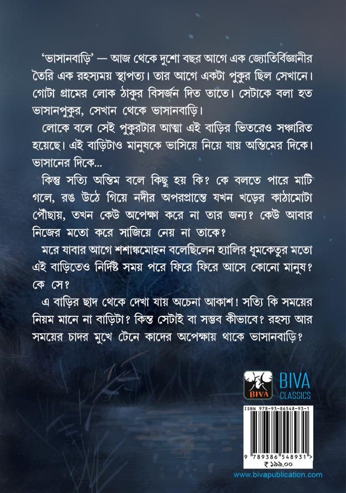সেই পুকুরটার আত্মা এই বাড়ির ভিতরেও সঞ্চারিত হয়েছে। এই বাড়িটাও মানুষকে ভাসিয়ে নিয়ে যায় অন্তিমের দিকে। ভাসানের দিকে... কিন্তু সত্যি অন্তিম বলে কিছু হয় কি? কে বলতে পারে মাটি গলে, রঙ উঠে গিয়ে নদীর অপরপ্রান্তে যখন খড়ের কাঠামোটা পৌছায়, তখন কেউ অপেক্ষা করে না তার জন্য? কেউ আবার নিজের মতো করে সাজিয়ে নেয় না তাকে? মরে যাবার আগে শশাঙ্কমোহন বলেছিলেন হ্যালির ধূমকেতুর মতো এই বাড়িতেও নির্দিষ্ট সময় পরে ফিরে ফিরে আসে কোনো মানুষ। কে সে? এ বাড়ির ছাদ থেকে দেখা যায় অচেনা আকাশ, সত্যি কি সময়ের নিয়ম মানে না বাড়িটা? কিন্তু কীভাবে? রহস্য আর সময়ের চাদর মুখে টেনে কাদের অপেক্ষায় থাকে ভাসান বাড়ি?