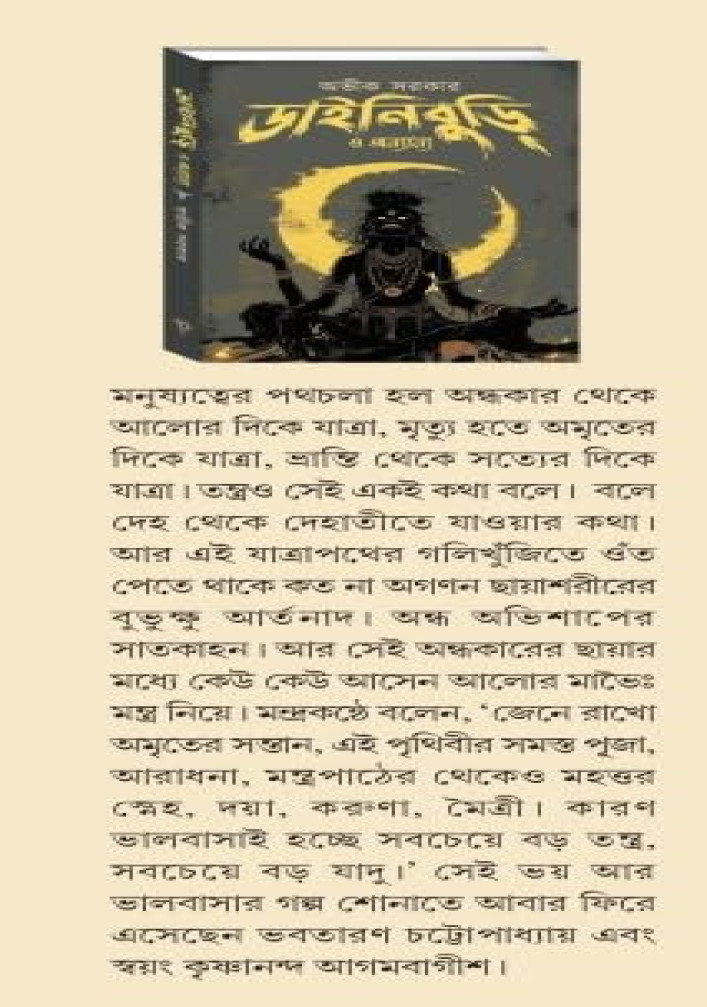 ত পেতে থাকে কত না অগণন ছায়াশরীরের বুভুক্ষু আর্তনাদ। অন্ধ অভিশাপের সাতকাহন। আর সেই অন্ধকারের ছায়ার মধ্যে কেউ কেউ আসেন আলোর মাভৈঃ মন্ত্র নিয়ে। মন্ত্রকন্ঠে বলেন, ‘জেনে রাখো অমৃতের সন্তান, এই পৃথিবীর সমস্ত পূজা, আরাধনা, মন্ত্রপাঠের থেকেও মহত্তর স্নেহ, দয়া, করুণা, মৈত্রী। কারণ ভালবাসাই হচ্ছে সবচেয়ে বড় তন্ত্র, সবচেয়ে বড় যাদু।’ সেই ভয় আর ভালবাসার গল্প শোনাতে আবার ফিরে এসেছেন ভবতারণ চট্টোপাধ্যায় এবং স্বয়ং কৃষ্ণানন্দ আগমবাগীশ।