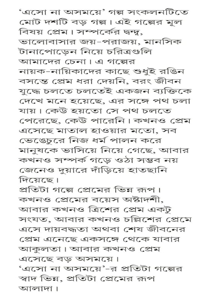 ‘এসো না অসময়ে’ গল্প সংকলনটিতে মোট দশটি বড় গল্প। এই গল্পের মূল বিষয় প্রেম। সম্পর্কের দ্বন্দ্ব, ভালোবাসার জয়-পরাজয়, মানসিক টানাপোড়েন নিয়ে চরিত্রগুলি আমাদের চেনা। এ গল্পের নায়ক-নায়িকাদের কাছে শুধুই র