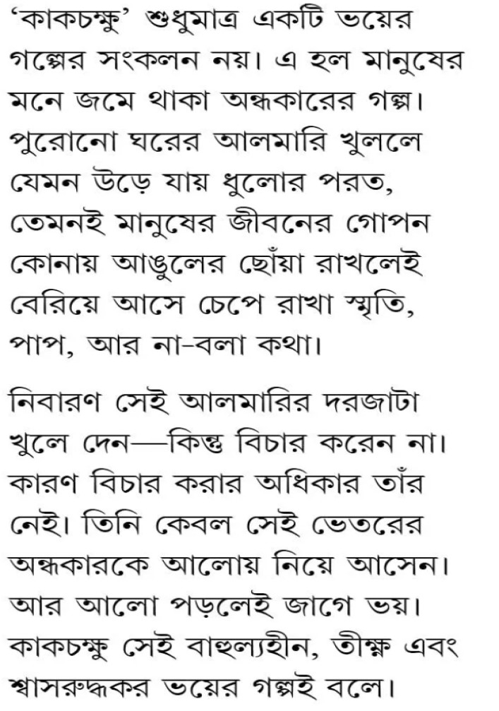 নিবারণ সেই আলমারির দরজাটা খুলে দেন-কিন্তু বিচার করেন না। কারণ বিচার করার অধিকার তাঁর নেই। তিনি কেবল সেই ভেতরের অন্ধকারকে আলোয় নিয়ে আসেন। আর আলো পড়লেই জাগে ভয়। কাকচক্ষু সেই বাহুল্যহীন, তীক্ষ্ণ এবং শ্বাসরুদ্ধকর ভয়ের গল্পই বলে।