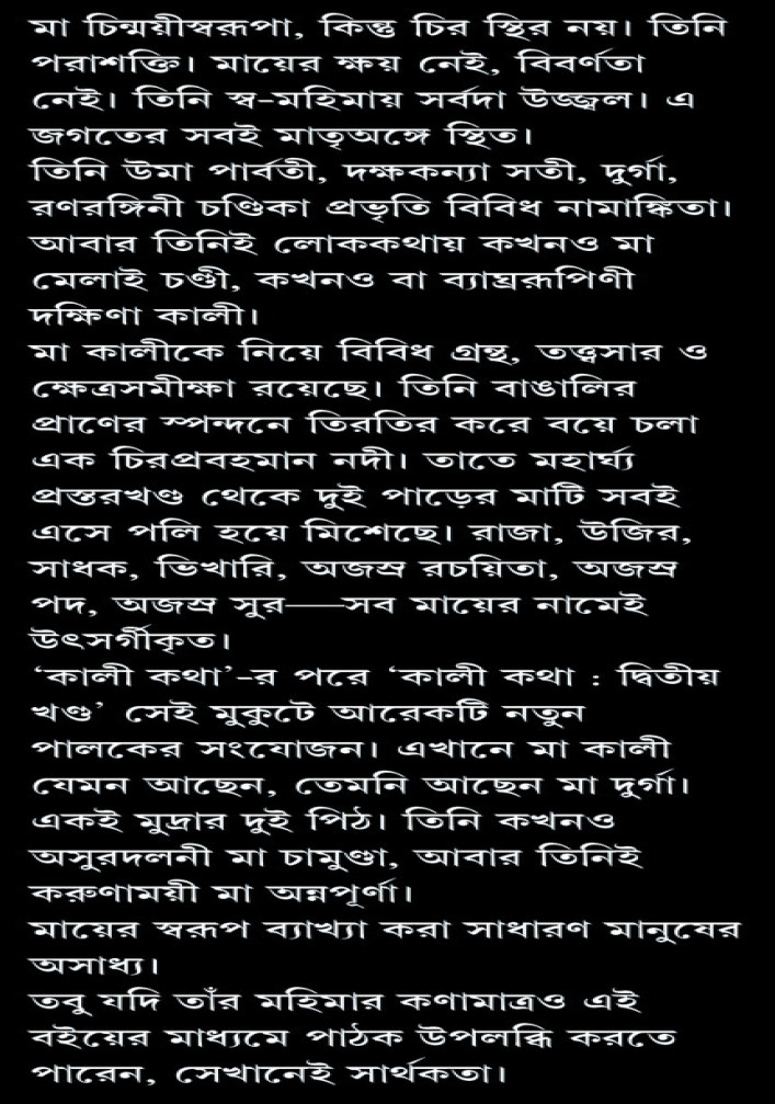 'কালী কথা'-র পরে 'কালী কথা: দ্বিতীয় খণ্ড' সেই মুকুটে আরেকটি নতুন পালকের সংযোজন। এখানে মা কালী যেমন আছেন, তেমনি আছেন মা দুর্গা। একই মুদ্রার দুই পিঠ। তিনি কখনও অসুরদলনী মা চামুণ্ডা, আবার তিনিই করুণাময়ী মা অন্নপূর্ণা।
