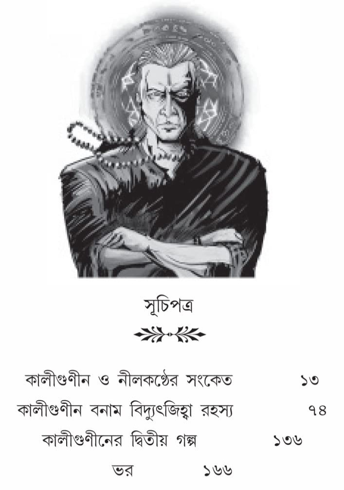িদ্যুৎজিহ্বার তৈরী এক অসামান্য বিদ্যা কিভাবে জড়িয়ে পড়লো এই রহস্যের সঙ্গে? কালীপদ কি পারবে নিজের ধুরন্ধর বুদ্ধি দিয়ে সবকটি যোগসূত্র জোড়া লাগিয়ে দেশকে সর্বনাশের থাবা থেকে বাঁচাতে? কালীগুণীন ও নীলকন্ঠের সঙ্কেত– উড়িষ্যার সীমান্ত থেকে ক্রমশ বাঙ্গালার দিকে তীব্র গতিতে এগিয়ে আসছে আধা মানুষের মতো এক হিংস্র জানোয়ার। কি উদ্যেশ্যে? পুরাণের সবচেয়ে রহস্যময় এক মহা রহস্য, যা আমাদের চোখের সামনেই এতকাল রূপকথার আড়ালে লুকিয়ে ছিল। সেই রহস্যের নাগাল পেতে মোকাবেলা করতে হবে এক হিংস্র রক্ষীর সঙ্গে। কালীগুণীন কি পারবে সেই অতি আশ্চর্য রহস্যকে উদ্ধার করতে? কালীগুণীনের দ্বিতীয় গল্প:- এক চিকিৎসক বদলি হবার পরে তার পরিবারকে নিয়ে উঠলেন এক হাসপাতাল-বাড়িতে। চিকিৎসকের পরিবার টের পেলেন যে এই বাড়িটায় তাঁরা ছাড়াও আরও ভয়ঙ্কর কারোর আনাগোনা আছে। এই বাড়ির অতীতের সঙ্গে জড়িয়ে আছে এক অতি নির্মম এবং বুকফাটা অভিশাপ। কালীপদ কি পারবে এই অতীতের অভিশাপের সন্ধান করে, তার বিহিত করে পরিবারটিকে রক্ষা করতে? ভর:- একজন গুণীনের জীবনের অসংখ্য চমকপ্রদ ঘটনার সঙ্গে থেকে যায় কিছু সাধারণ ঘটনা, কিন্তু গুরুত্বের দিকে তা কোনো অংশেই লঘু নয়। এক গ্রাম্য গৃহবধূর শরীরে প্রেতিনীর ভর পড়া এবং সেই সূত্রে এক নিষ্ঠুর অতীতকে খুঁজে বের করার এক কাহিনী।