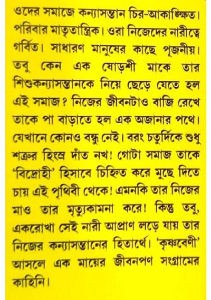 টাও বাজি রেখে তকে পা বাড়াতে হল এক অজানার পথে? যেখানে কোনো বন্ধু নেই। বরং চতুর্দিকে শুধু শত্রুর হিংস্র দাঁত-নখ। 'কৃষ্ণবেণী' আসলে এক মায়ের জীবনপণ সংগ্রামের কাহিনি।