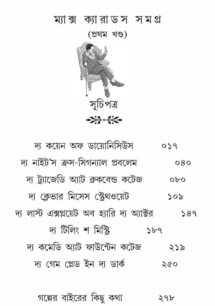 শি ভালো গোয়েন্দা- ম্যাক্স, নাকি শার্লক, তা নিয়ে ইউরোপের গোয়েন্দা গল্পের পাঠকমহলে এখনও তর্ক চলে। ঠিক যেমনটা আমাদের ফেলুদা বনাম ব্যোমকেশ। আর্নেস্ট ব্রামা সৃষ্ট গোয়েন্দা চরিত্র ম্যাক্স ক্যারাডসকে শার্লক হোমসের সঙ্গে তুলনা করেছেন স্বয়ং জর্জ অরওয়েল। বিশ্বসাহিত্যে ম্যাক্সের মতো গোয়েন্দা বিরল। দৃষ্টিশক্তিহীন এই গোয়েন্দার রহস্যভেদের চারটি অস্ত্র ঘ্রাণ, শ্রবণ, স্পর্শ ও মগজাস্ত্র। ঠিক এই কারণেই সমসাময়িক গোয়েন্দাকাহিনিগুলোর তুলনায় ম্যাক্স ক্যারাডসের কাহিনিগুলোর প্লট বেশ আলাদা এবং সময়ের তুলনায় বেশ কিছুটা এগিয়ে। তাঁর ভক্তরা তাঁকে 'দ্য ডিফেকটিভ ডিটেকটিভ', 'দ্য ব্লাইন্ড ডিটেকটিভ' বা 'দ্য ব্লাইন্ড শার্লক হোমস' নামেও ডাকতেন। এই প্রথমবার সেই গোয়েন্দার সব কাহিনি সমগ্র রূপে বাংলায়। প্রথম খণ্ডে রইল ম্যাক্স ক্যারাডসের আবির্ভাবের প্রথম আটটি কাহিনি।