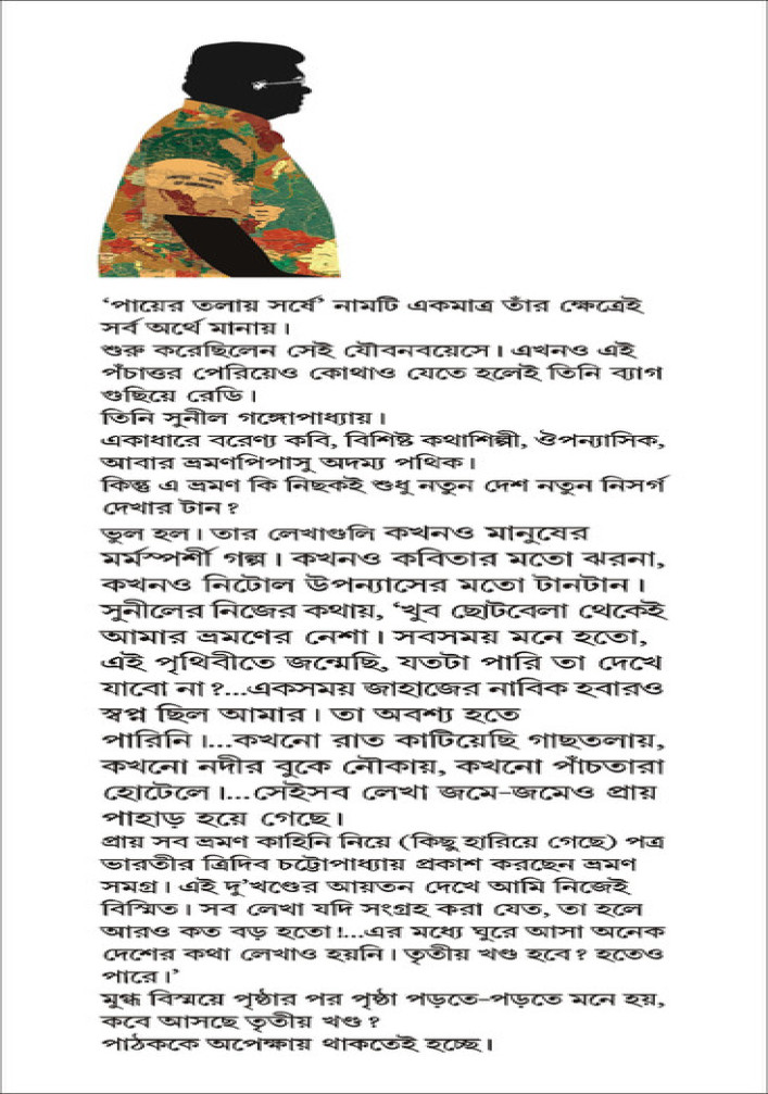 ভুল হল। তার লেখাগুলি কখনও মানুষের মর্মস্পর্শী গল্প। কখনও কবিতার মতো ঝরনা, কখনও নিটোল উপন্যাসের মতো টানটান। সুনীলের নিজের কথায়, 'খুব ছোটবেলা থেকেই আমার ভ্রমণের নেশা। সবসময় মনে হতো, এই পৃথিবীতে জন্মেছি, যতটা পারি তা দেখে যাবো না?... একসময় জাহাজের নাবিক হবারও স্বপ্ন ছিল আমার। তা অবশ্য হতে পারিনি।... কখনো রাত কাটিয়েছি গাছতলায়, কখনো নদীর বুকে নৌকায়, কখনো পাঁচতারা হোটেলে।... সেইসব লেখা জমে-জমেও প্রায় পাহাড় হয়ে গেছে। প্রায় সব ভ্রমণ কাহিনি নিয়ে (কিছু হারিয়ে গেছে) পত্র ভারতীর ত্রিদিব চট্টোপাধ্যায় প্রকাশ করছেন ভ্রমণ সমগ্র। এই দু'খণ্ডের আয়তন দেখে আমি নিজেই বিস্মিত। সব লেখা যদি সংগ্রহ করা যেত, তা হলে আরও কত বড় হতো!...এর মধ্যে ঘুরে আসা অনেক দেশের কথা লেখাও হয়নি। তৃতীয় খণ্ড হবে? হতেও পারে।' মুগ্ধ বিস্ময়ে পৃষ্ঠার পর পৃষ্ঠা পড়তে-পড়তে মনে হয়,কবে আসছে তৃতীয় খণ্ড?
