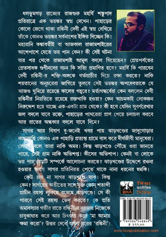 রাজামশাই আমূল যেন বদলে গিয়েছেন? প্রেতপর্বতের প্রেতসাধক গুনীণদের বচন কী সত্যি প্রমাণিত হবে? মহর্ষি কী পারবেন দেবী রঙ্কিণীর শক্তিঅঙ্গকে গর্ভপ্রাচীর দিয়ে রক্ষা করতে? নাকি শয়তানের অনুচরেরা জাগিয়ে তুলবে সেই ভয়ঙ্কর অপদেবতাকে যে আজও ঘুমিয়ে রয়েছে কালের গহ্বরে? মর্ত্যগন্ধর্বেরা কেন বললেন দেবী রঙ্কিণীর নিয়তিতে রয়েছে রক্তখাকি হওয়া? কেন আচমকাই লোকজন নিরুদ্দেশ হয়ে যাচ্ছে এক একটা গ্রাম থেকে? কী হবে সেদিন যেদিন সুবর্ণরেখার জল বদলে যাবে রক্তে, পাহাড়ের পাথরেরা প্রাণ পেয়ে চলাচল করবে আর রাতের অন্ধকার বদলে যাবে দিনে? সাগর আর বিষাণ, দুজনেই খবর পায় ঝাড়খণ্ডের জাদুগোড়ার কাছাকাছি কোনো পাহাড়ি প্রত্যন্ত গ্রামে বসবাস করে দীর্ঘজীবী মানুষেরা। লোকে বলে তারা নাকি অমর। কিন্তু ঝাড়খণ্ডে পৌঁছে ওরা জানতে পারে, সেই গ্রাম নাকি অভিশপ্ত। কীসের অভিশাপে অভিশপ্ত হয়ে রয়েছে গ্রামটি? কেনই বা লোকে ভয় পায় গ্রামটি সম্পর্কে আলোচনা করতে? ঝাড়খণ্ডে বেরোনোর আগে প্রতিনয়ত সাগর পেতে থাকে নানান ধরনের হুমকি। কেউ চায় না সাগর ঝাড়খণ্ডে যাক? কিন্তু কেন? সাগরের অতীতের কোন শতাব্দী প্রাচীন রহস্য লুকিয়ে রয়েছে ঝাড়খণ্ডে? সে কী পারবে সেই রহস্য ভেদ করতে? কে প্রতি অমাবস্যার গভীর রাতে রঙ্কিণীর দরজায় নিজেকে চাবুকাঘাত করে চিৎকার করে ওঠে” মা আমায় ক্ষমা কর!” বলে? সাগর বুকের ঠিক মাঝখানে একটা ক্ষতচিহ্ন নিয়ে জন্মেছে? এ কী সাধারণ কোনো জন্মদাগ? নাকি এই চিহ্নের ভেতরে এমন কিছু লুকিয়ে রয়েছে যা জাগিয়ে তুলবে এক অতীতের এক অভিশপ্ত দেবতাকে? আর বদলে দেবে সৃষ্টির ভবিষ্যৎ?